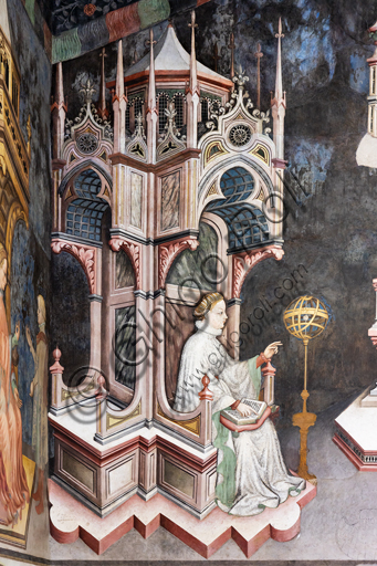 Foligno, Trinci Palace:  The Hall of Liberal Arts and Planets. In this hall the symbolic figures of the seven planets are represented (Moon, Mars, Mercury, Jupiter, Venus, Saturn, Sun) following the order of the days of the week. Each planet oversees a phase of human life that is depicted inside concentric disks where in the middle zone, the Air, the Sun and the Moon define a specific time of day. On the north wall of the Hall the Arts of Trivio (Grammar, Dialectic, Rhetoric) and of the Quadrivium (Arithmetic, Music, Geometry and Astronomy) were depicted, according to a hierarchical order of learning that leads to the point of arrival of all human knowledge, Philosophy , which triumphs in the center of the wall opposite the window. Each planet influences a phase of human life, at each stage of human life corresponds, in the learning scale, a different discipline, each discipline is similar, for its properties, to one of the celestial spheres. The decoration is entrusted to Gentile da Fabriano, the greatest exponent of international Gothic in Italy, with aids (Jacopo Bellini, Paolo Nocchi, Francesco Giambono from Bologna and Domenico da Padova's Battista), and realized the 1411 and 1412 trails. Detail of the Arithmetic on the left and the Rhetoric on the right.