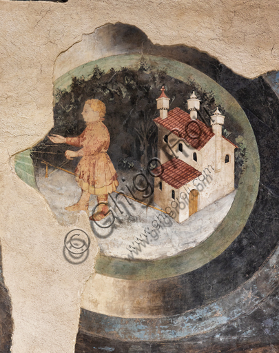 Foligno, Trinci Palace:  The Hall of Liberal Arts and Planets. In this hall the symbolic figures of the seven planets are represented (Moon, Mars, Mercury, Jupiter, Venus, Saturn, Sun) following the order of the days of the week. Each planet oversees a phase of human life that is depicted inside concentric disks where in the middle zone, the Air, the Sun and the Moon define a specific time of day. On the north wall of the Hall the Arts of Trivio (Grammar, Dialectic, Rhetoric) and of the Quadrivium (Arithmetic, Music, Geometry and Astronomy) were depicted, according to a hierarchical order of learning that leads to the point of arrival of all human knowledge, Philosophy , which triumphs in the center of the wall opposite the window. Each planet influences a phase of human life, at each stage of human life corresponds, in the learning scale, a different discipline, each discipline is similar, for its properties, to one of the celestial spheres. The decoration is entrusted to Gentile da Fabriano, the greatest exponent of international Gothic in Italy, with aids (Jacopo Bellini, Paolo Nocchi, Francesco Giambono from Bologna and Domenico da Padova's Battista), and realized the 1411 and 1412 trails. Detail of  the Adolescence.